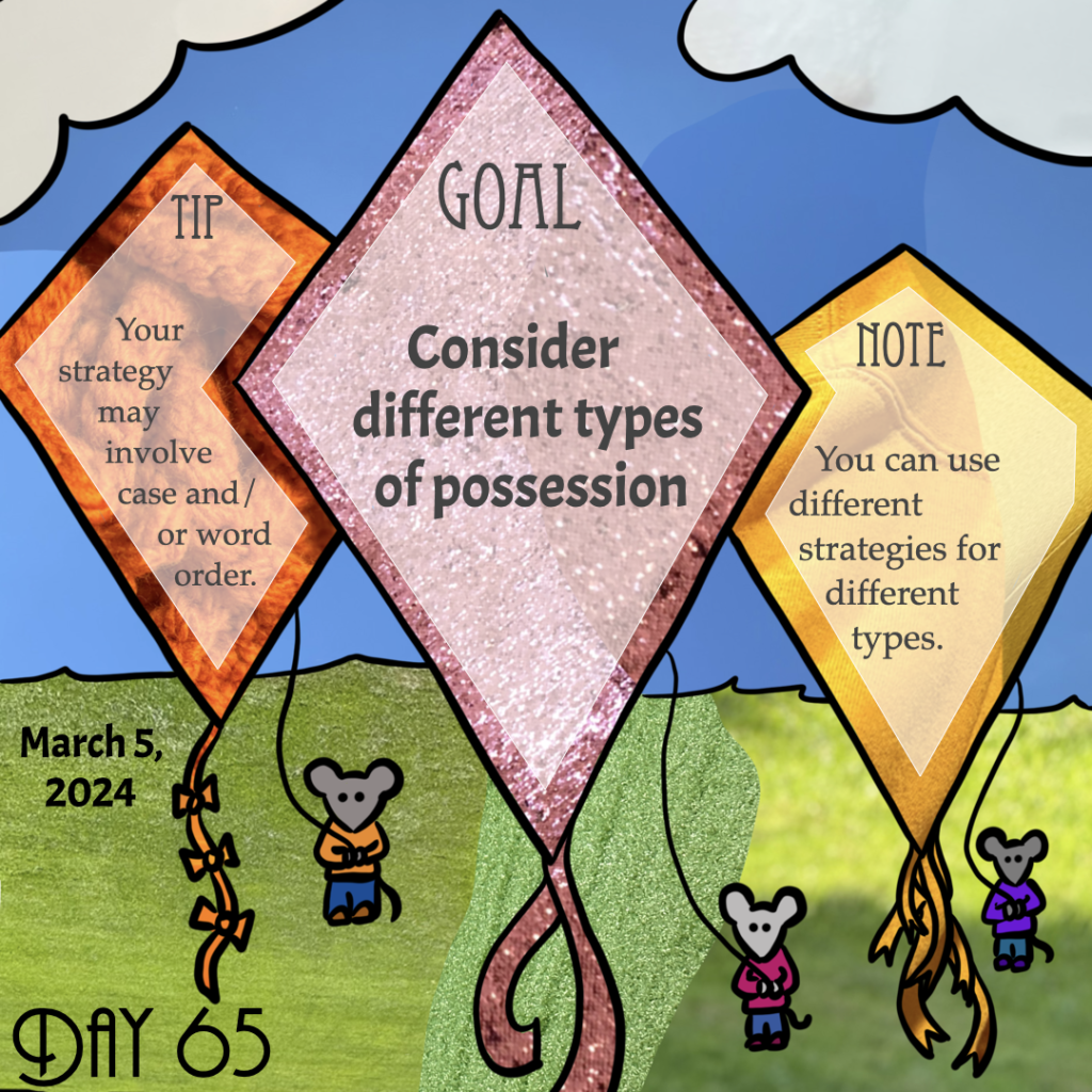 Some languages distinguish between alienable and inalienable possession, marking those relationships differently. Inalienable possession typically refers to a relationship between possessor and possessed that is a more inherent and less breakable bond. Common examples of inalienable possession include body parts (e.g. the dog’s nose) and kinship terms (e.g. the cat’s mother). Alienable possession covers the types of possession that are more commonly associated with possession, including owned objects (e.g. Sara’s car, Torin’s umbrella, the fox’s den).