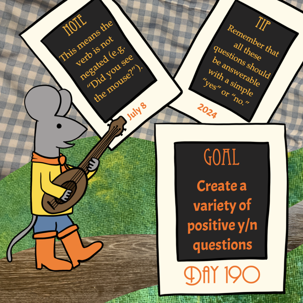 Once you’ve done that, create a variety of positive y/n questions (e.g. “Did you see the mouse?”). Try to incorporate different verb types to make sure you create example questions with different argument structures (e.g. transitive, intransitive). As you work, remember that all these questions should be answerable with a simple “yes” or “no.”